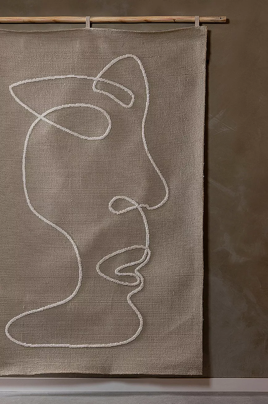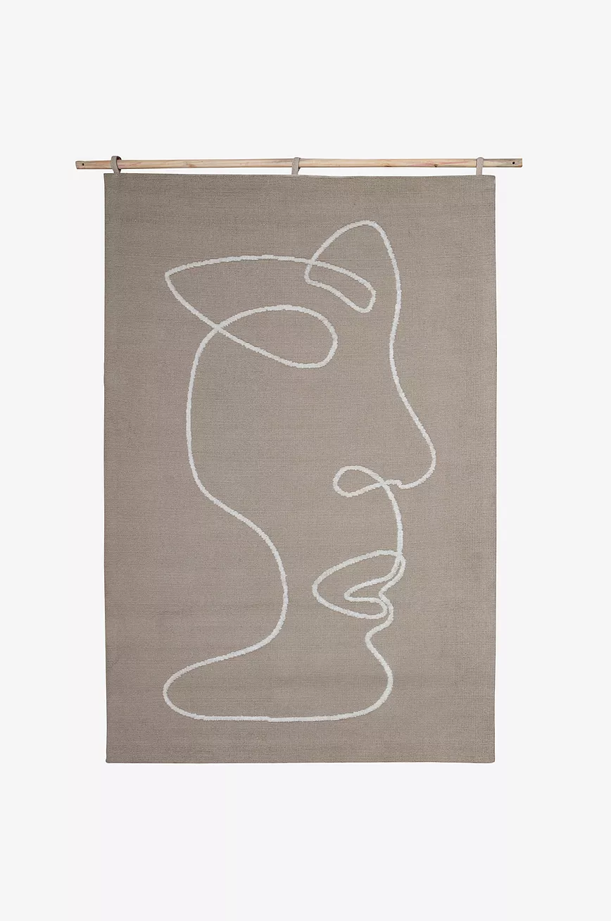 Dette vakre gobelenget inngår i en eksklusiv kolleksjon fra det nederlandske interiørmerket WOOOD, og har en slående design med linjer i form av et ansikt. Gobelenget Zeno er en sofistikert vev produsert av 100% kunstfiber. Den grågrønne nyansen smelter lett inn i en rekke ulike interiørstiler. Når opphengssystemet fjernes kan gobelenget også brukes som teppe.